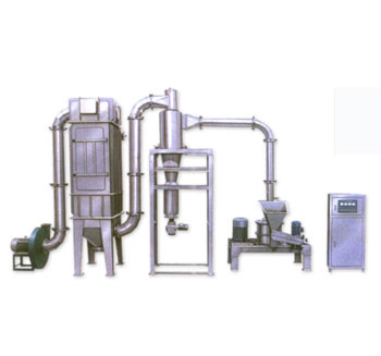 物料由料斗经螺旋输送器进入粉碎室,被高速旋转的刀片剪切粉碎,通过负压风运的方法把物料运入旋风分离器、袋式除尘器、排出物料达到产品的要求。